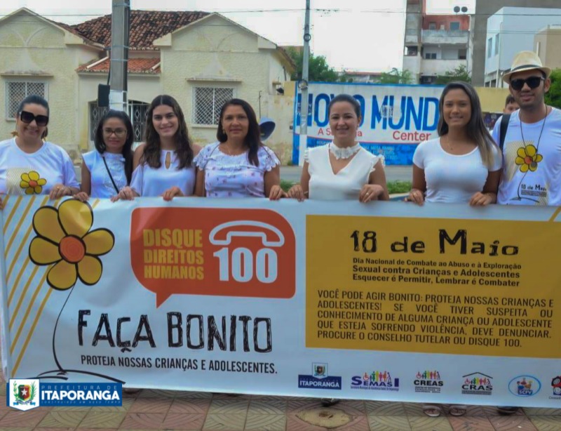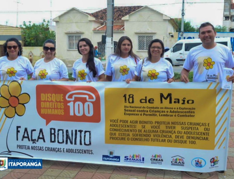 A Prefeitura Municipal de Itaporanga, através da Secretaria Municipal de Assistência Social de Itaporanga, e também, através do Centro de Referência Especializado de Assistência Social-CREAS vêm realizando ao longo do mês de maio várias ações alusivas acerca da conscientização, prevenção e enfrentamento ao abuso e exploração sexual contra crianças e adolescentes. Dentre as ações está sendo realizado em algumas escolas públicas municipais da zona urbana e rural atividades lúdicas acerca da temática, através de contação de histórias, com o intuito de conscientizar para prevenir o público infantil acerca da violência sexual.Também foi realizada uma caminhada nas principais ruas da cidade, com o objetivo de alertar a população sobre o abuso e exploração sexual contra crianças e adolescentes, enfatizando ainda a importância da denúncia.