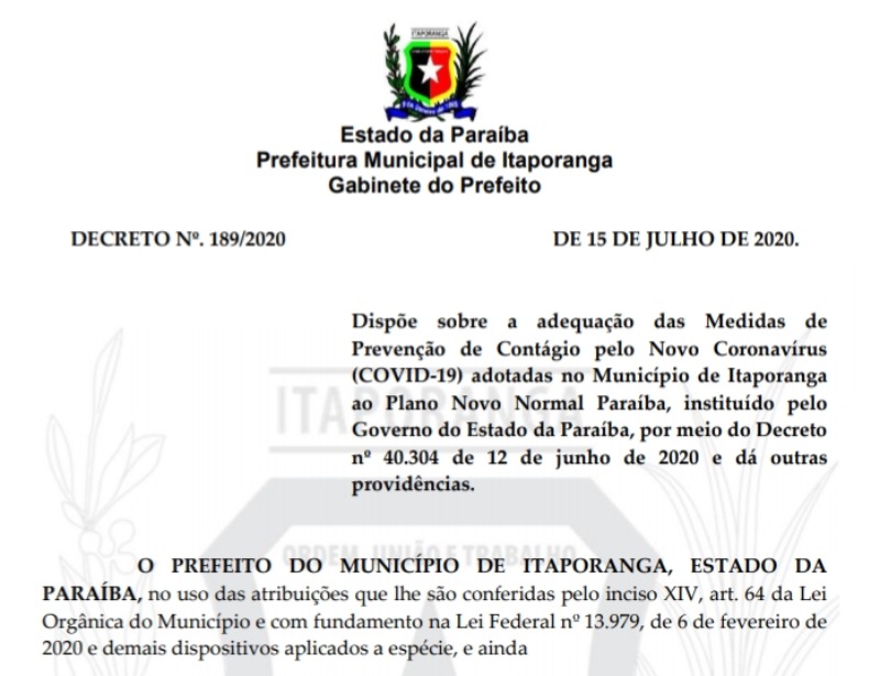 O prefeito de Itaporanga, Divaldo Dantas, assinou na manhã desta quarta (15), o decreto nº 189/2020 que dispõe sobre a adequação das medidas de prevenção de contágio ao novo coronavírus, com base no Plano 'Novo Normal Paraíba' estabelecido pelo Governo do Estado.Conforme o Plano, Itaporanga foi classificada pela condição da bandeira amarela, o que permite, a medida de flexibilização das atividades econômicas. Apesar da condição, é necessário que todos os estabelecimentos contemplados com a flexibilização – mantenham os protocolos de proteção ao contágio do novo coronavírus.