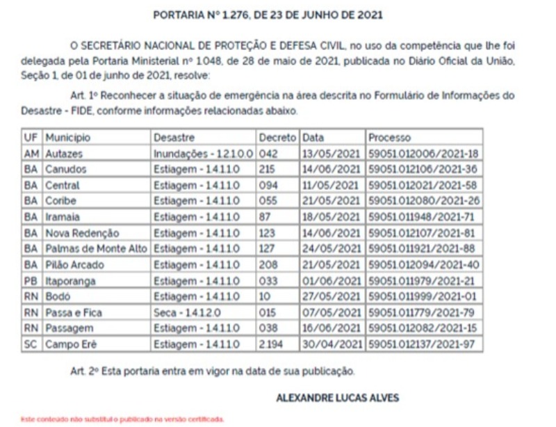 Diante desse pedido, a Secretaria Nacional de Proteção e Defesa Civil, órgão pertencente ao Ministério do Desenvolvimento Regional (MDR) publicou hoje (25), portaria que reconhece a Situação de Emergência por Estiagem que persiste aos longos dos anos, no município de Itaporanga-PB.