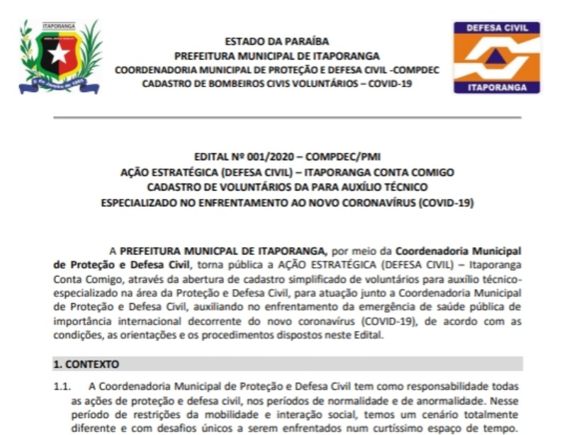 A coordenadoria de Proteção e Defesa Civil de Itaporanga publicou nesta quarta-feira (6), o edital nº 001-2020 que visa realizar o cadastro de Bombeiros Civis para auxílio das atividades desenvolvidas no enfrentamento à pandemia do novo coronavírus.O edital foi publicado no Site do Município e o período de inscrição começa na quinta-feira (7) e segue até o dia 30 deste mês. O procedimento será feito por
