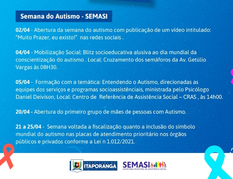 Como o dia 2 de abril é comemorado o Dia Internacional do Autismo, a Secretária Municipal de Assistência Social deixa claro que todos os serviços e programas estão abertos para ser acessado por esta demanda.