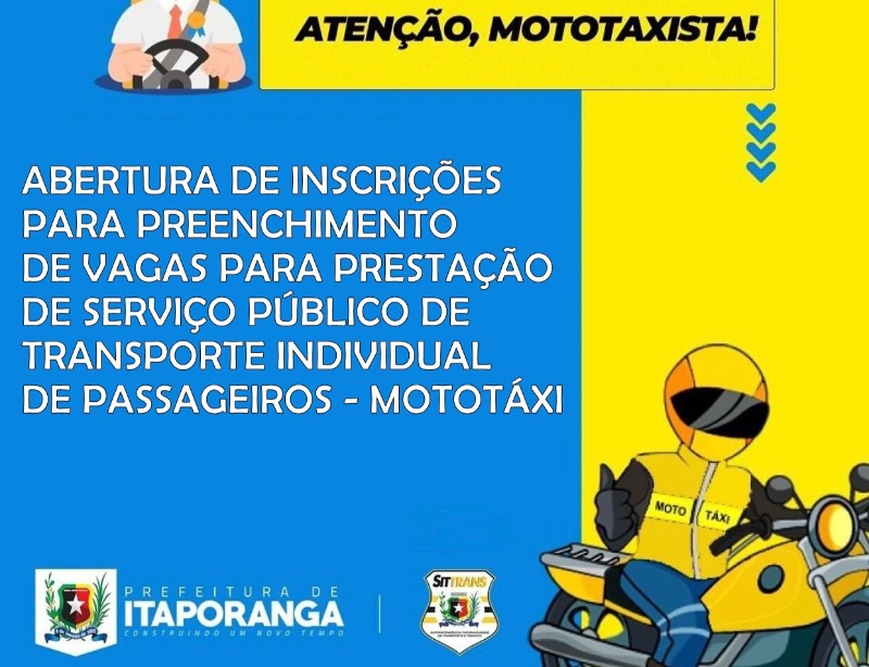 A SITTRANS torna pública a abertura de inscrições e estabelece normas relativas ao preenchimento de vagas para interessados que que desejam trabalhar regularmente prestando o serviço de mototáxi na cidade de Itaporanga-PB, para preenchimento de 30 (trinta) vagas, em observância as Normas Legais que regem o serviço de mototáxi.