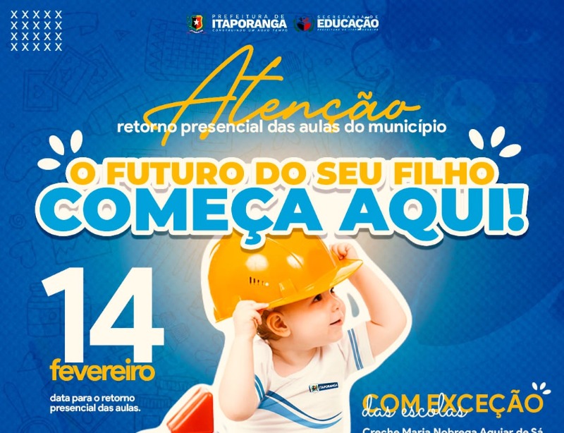 A Prefeitura de Itaporanga, através da Secretaria de Educação, anunciou nessa sexta-feira (11) o início das aulas presenciais a partir da segunda-feira (14). O retorno presencial acontecerá mediante a adoção de medidas preventivas a Covid-19.